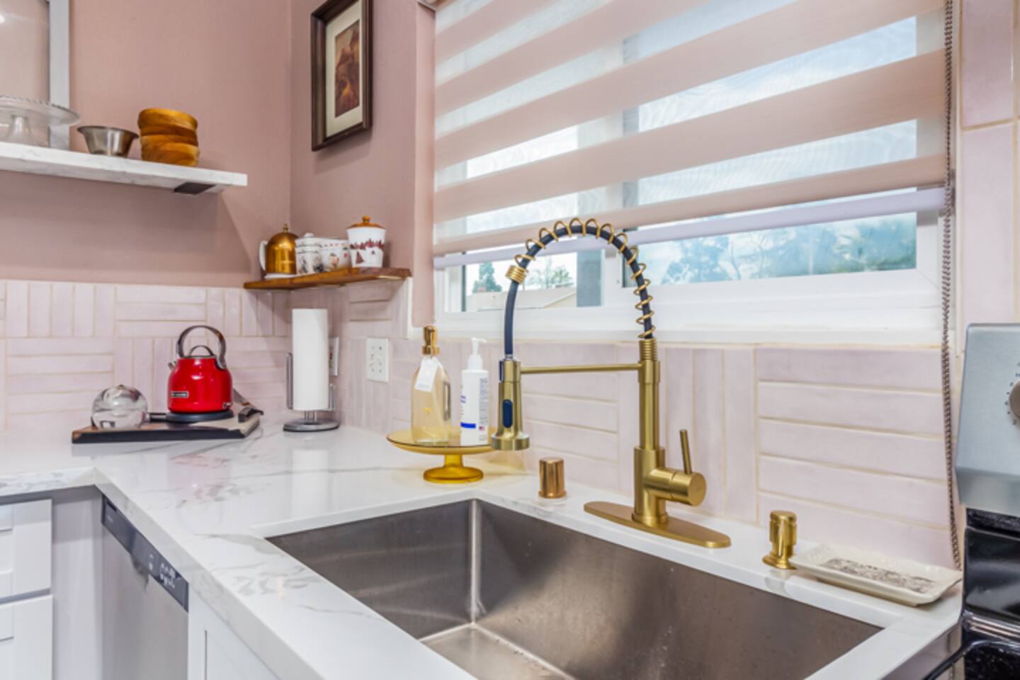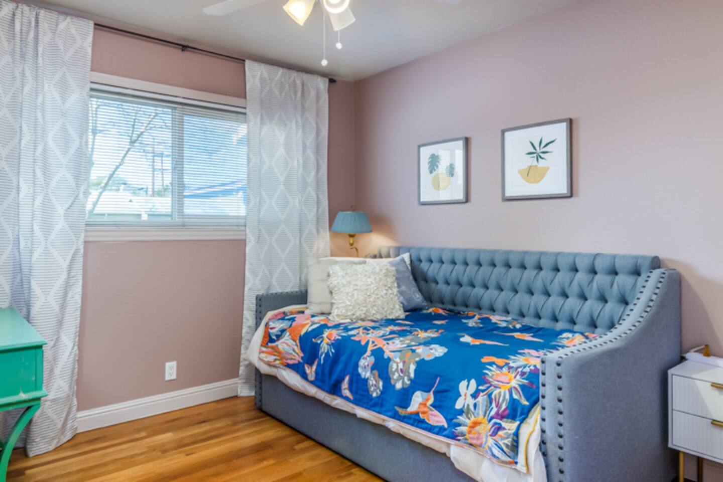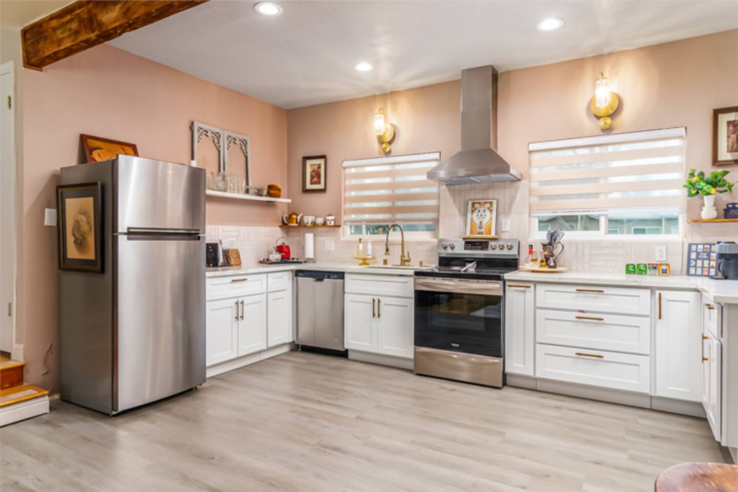Our home features 3 bedrooms and 2 modern bathrooms. At the heart of the home is a classy and elegant kitchen, designed to be both functional and beautiful. Equipped with new appliances, polished countertops, and custom cabinetry. This kitchen connects seamlessly to the dining room, creating an ideal space for meal preparation and enjoyable dining experiences. The chic dining area enhances every meal with its inviting atmosphere. Adjacent to the dining room, the separate living room provides a cozy and stylish space for unwinding. Furnished with taste and comfort in mind, this area is perfect for relaxing after a day of exploring or for spending quality time with loved ones. The master suite offers a retreat with a king-sized bed and an en-suite bathroom, providing both privacy and comfort. The two secondary bedrooms are thoughtfully decorated and share a beautifully designed hallway bathroom. One bedroom features a charming queen bed, while the other has a versatile trundle bed, ideal for accommodating additional guests or children. For those needing to stay connected or get some work done, the home includes a dedicated work station, ensuring a productive and comfortable environment. Step outside to enjoy the serene backyard, a perfect spot for morning coffee or evening relaxation in a tranquil setting.