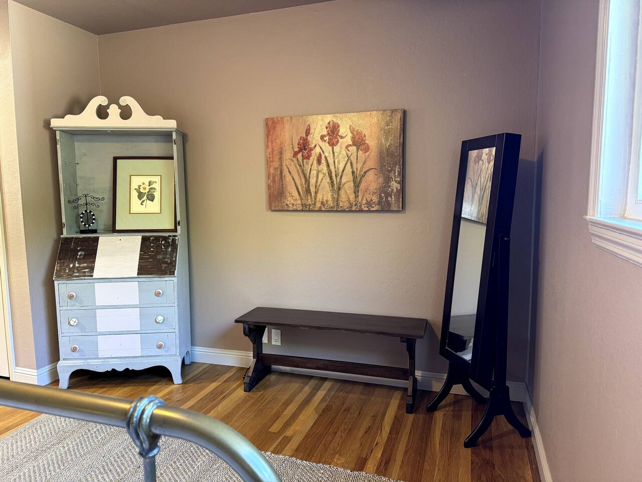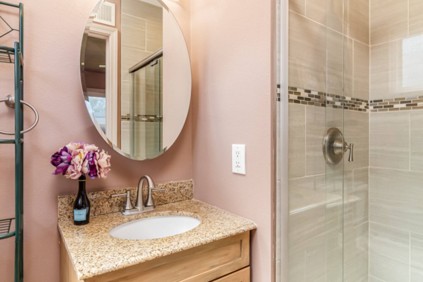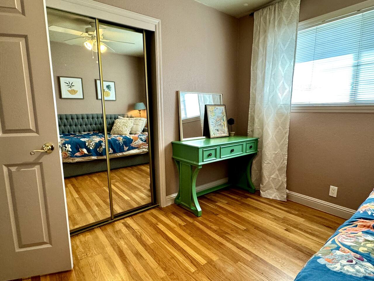 Our home features 3 bedrooms and 2 modern bathrooms. At the heart of the home is a classy and elegant kitchen, designed to be both functional and beautiful. Equipped with new appliances, polished countertops, and custom cabinetry. This kitchen connects seamlessly to the dining room, creating an ideal space for meal preparation and enjoyable dining experiences. The chic dining area enhances every meal with its inviting atmosphere. Adjacent to the dining room, the separate living room provides a cozy and stylish space for unwinding. Furnished with taste and comfort in mind, this area is perfect for relaxing after a day of exploring or for spending quality time with loved ones. The master suite offers a retreat with a king-sized bed and an en-suite bathroom, providing both privacy and comfort. The two secondary bedrooms are thoughtfully decorated and share a beautifully designed hallway bathroom. One bedroom features a charming queen bed, while the other has a versatile trundle bed, ideal for accommodating additional guests or children. For those needing to stay connected or get some work done, the home includes a dedicated work station, ensuring a productive and comfortable environment. Step outside to enjoy the serene backyard, a perfect spot for morning coffee or evening relaxation in a tranquil setting.